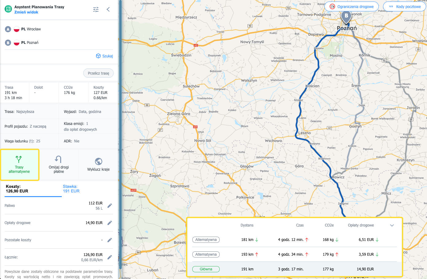 - Отметнете „ Покажи алтернативни маршрути“ . Картата ще покаже до 3 алтернативи и таблица с разстояние/време/пътни такси/CO₂e.