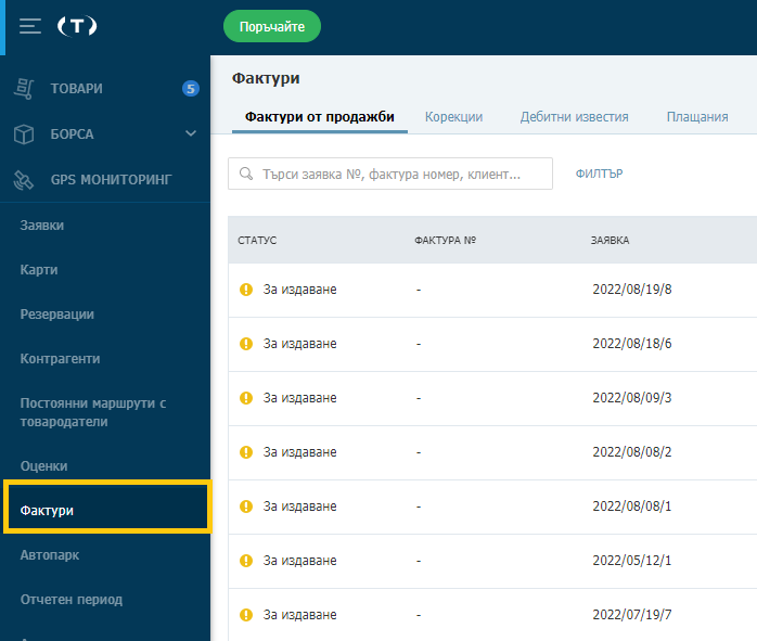 - Фактури за продажба - тук се появяват фактури със статуси: "За издаване", "В подготовка", "Издадена" и " Коригирана".