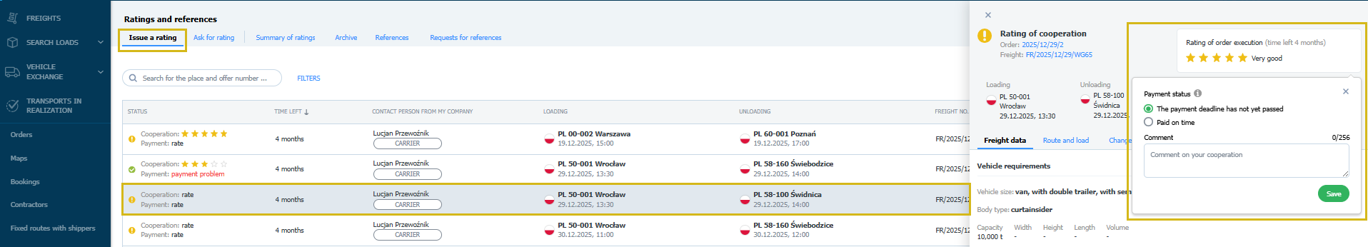 Ако транзакцията е сключена на Платформата, след нейното изпълнение имате възможност да дадете оценка на контрагента и да определите статуса на плащането.