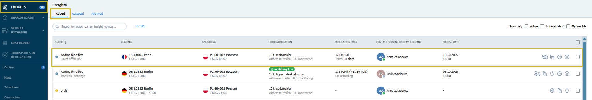 - Das Angebot wird an die ausgewählten Empfänger gesendet, Sie finden es im Modul Frachts im Tab Hinzugefügt mit dem Status Wartet auf Angebote.