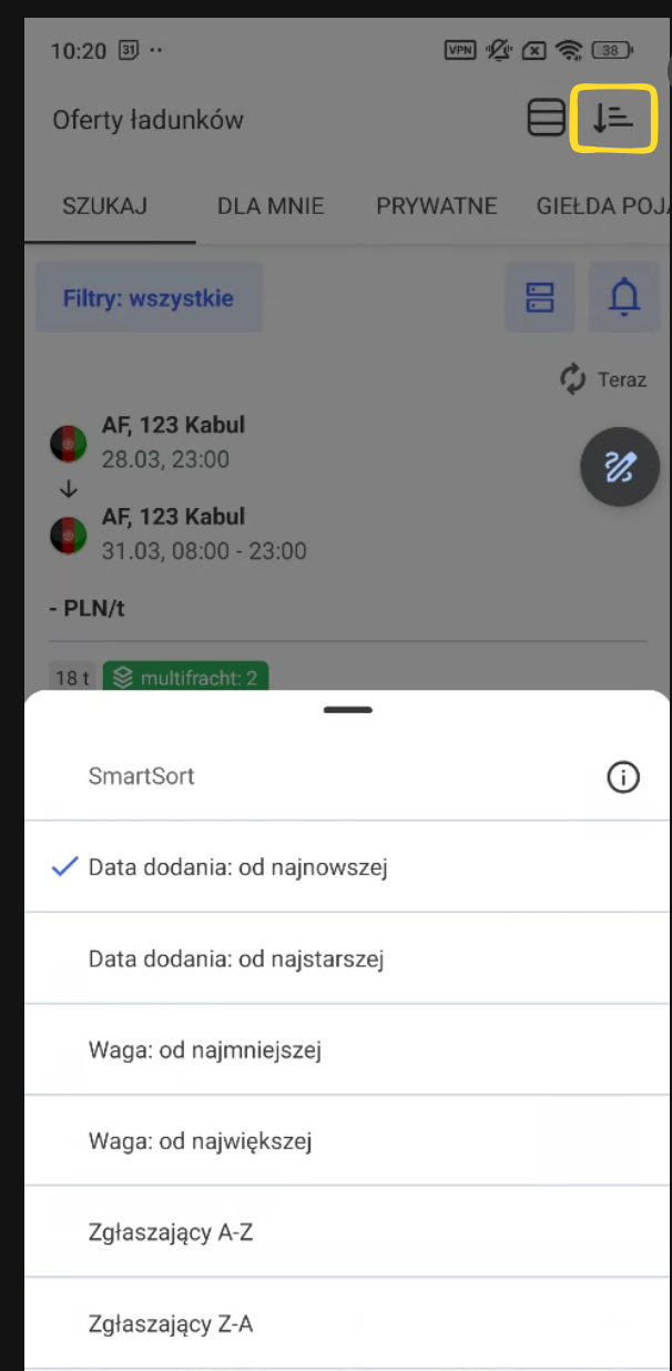Search results are sorted by date by default (the newest freight offers appear at the top). You can change the sorting method using the following parameters: