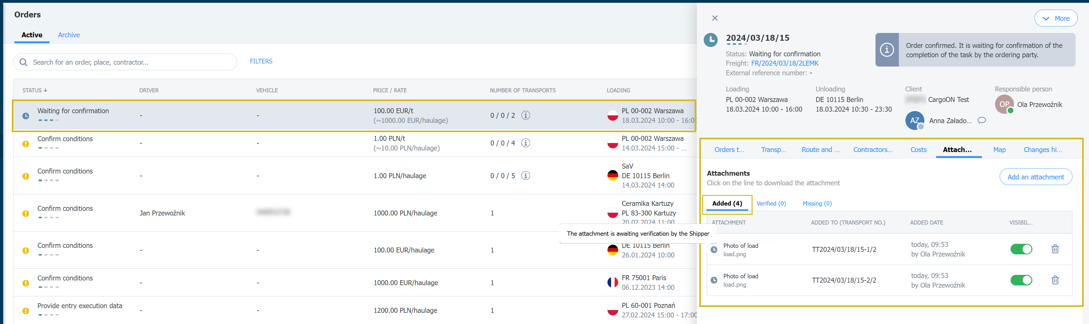 - Le statut suivant de la commande - En attente de confirmation - signifie que toutes les tâches de transport ont été effectuées, que les documents requis ont été ajoutés et vérifiés. L'expéditeur doit maintenant confirmer l'exécution.
