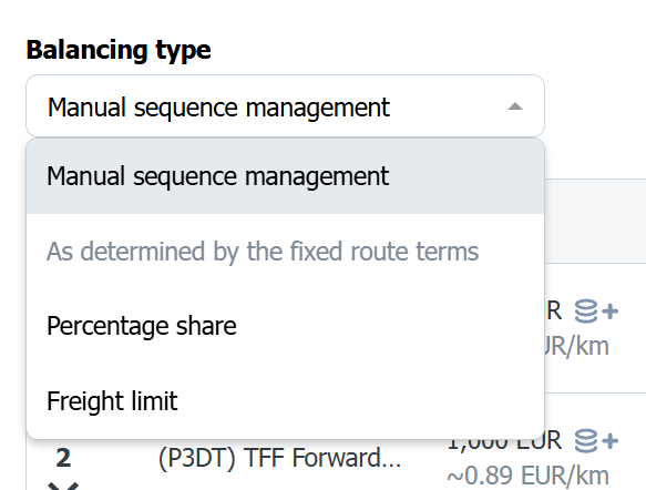 Šį balansavimo tipą galite pasirinkti, jei fiksuoto maršruto sąlygose nustatote planuojamą krovinių skaičių. Naudojant šį balansavimo tipą, jūsų krovinių pasiūlymai bus paskirstyti pagal iš anksto nustatytas vežėjų sąlygas.