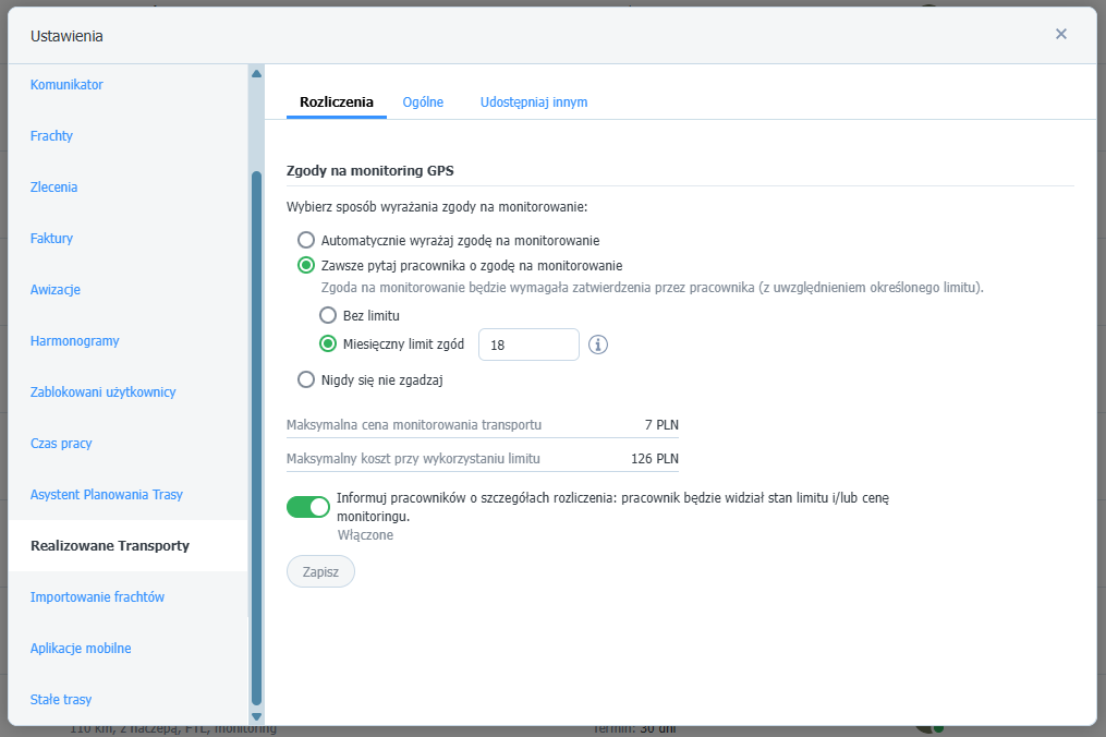 - W zakładce Rozliczenia możesz zarządzać zgodami i kosztami związanymi z monitoringiem GPS.
