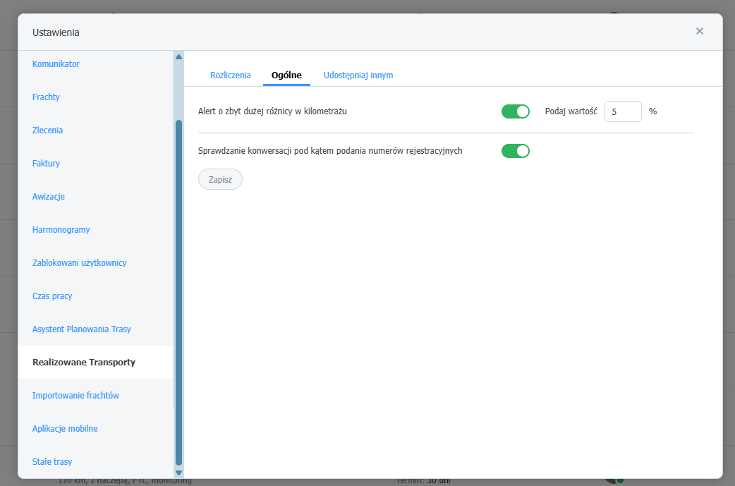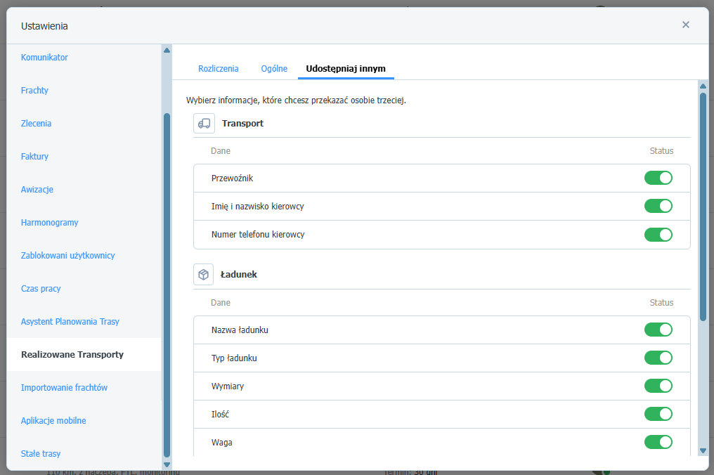 Ustawienia w module Realizowane transporty