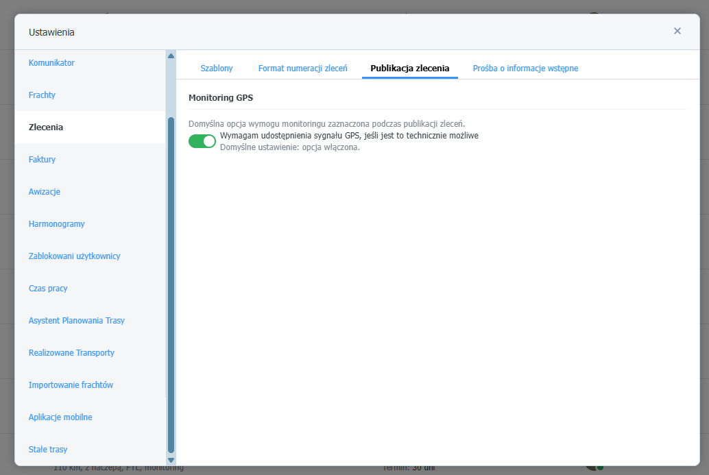 Konfiguracja ustawień monitoringu GPS w module Zlecenia