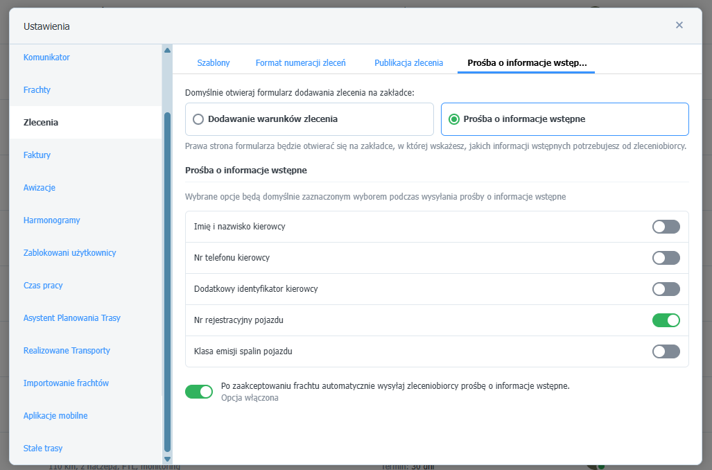 - Włącz opcję - Po zaakceptowaniu frachtu automatycznie wysyłaj zleceniobiorcy prośbę o informacje wstępne.