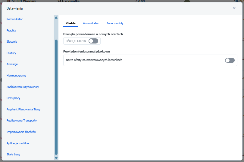 - Z menu po lewej stronie wybierz moduł, w którym znajdują się ustawienia dla monitoringu: Realizowane transporty, Zlecenia, Frachty, Powiadomienia i dźwięki