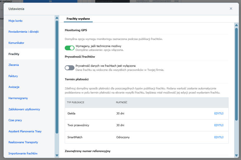 Konfiguracja ustawień monitoringu GPS w module Frachty