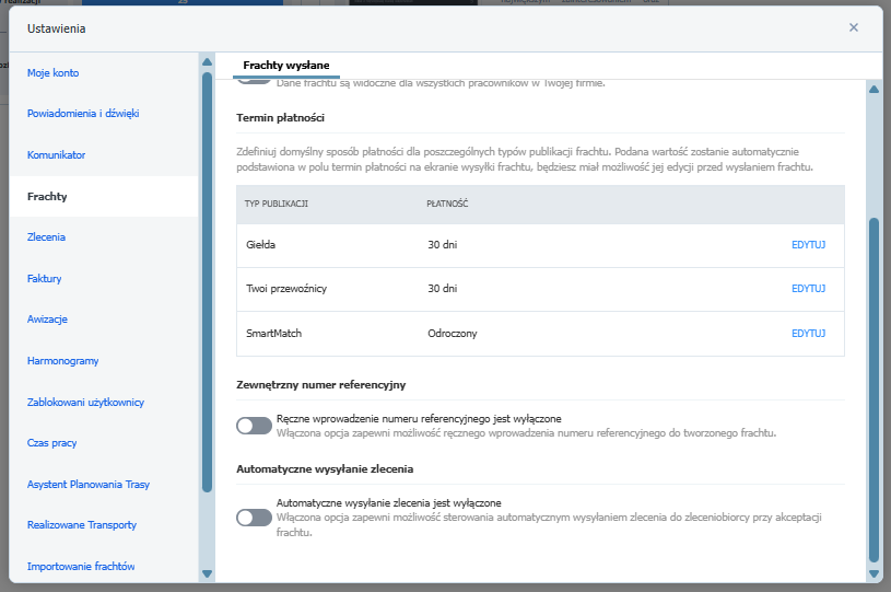 - Aby móc korzystać z opcji Poproś o informacje wstępne w zakładce Frachty wyłącz ustawienia - Automatyczne wysyłanie zlecenia.