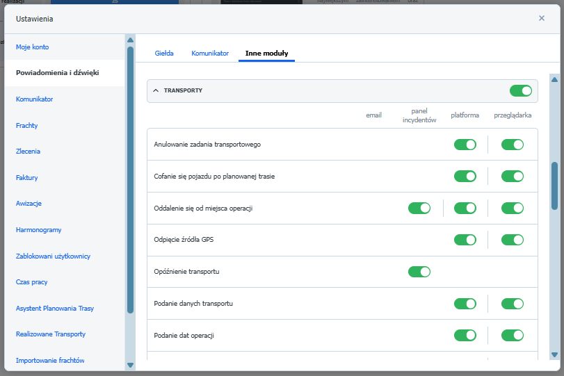 Powiadomienia i dźwięki Platformy Trans.eu